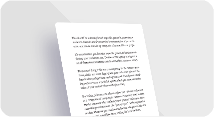 This should be a description of a specific person in your primary audience. It can be a real person who is representative of your audi- ence, or it can be a made-up composite of several different people. It’s essential that you describe a specific person, as it makes posi- tioning your book more real. Don’t describe a group or a type or a set of characteristics: create an individual with a name and a story. The point of doing it this way is to set you up for the next two ques- tions, which are about digging into your audience’s pain and the benefits they will get from reading your book. Clearly understand- ing both serves as a yardstick against which you can measure the value of your content when you begin writing. If possible, pick someone who energizes you—either a real person or a composite of real people. Someone you really want to help, maybe someone who reminds you of yourself before you knew everything you know now (the “younger you” can be a great ideal reader). The more you envision a real person who you can help, the more excited you will be about writing this book for them. AUDIENCE QUESTION #3: WHAT PAIN IS THIS PERSON EXPERIENCING BECAUSE THEY HAVE NOT READ YOUR BOOK? This step is about expressing your reader’s pain. How are they suf- fering, what are they missing out on, what do they not have that they want? They are depressed and suffering—how, specifically, and why? Your answer should only be about the problems they currently have, not the solutions. Your book is the cure, but we first have to know what ails them. Sometimes Questions 3 and 4 overlap a little, that is fine. In fact, you might have written the pain in the description of the person, if so, just cut and paste and move it here. 74 · ThE SCriBE METhOD