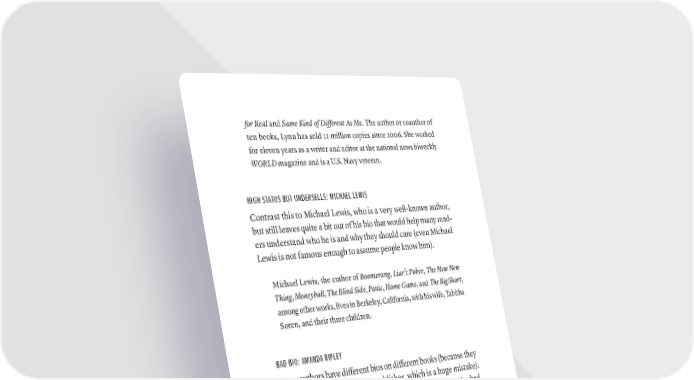 for Real and Same Kind of Different As Me. The author or coauthor of ten books, Lynn has sold 12 million copies since 2006. She worked for eleven years as a writer and editor at the national news biweekly WORLD magazine and is a U.S. Navy veteran. HIGH STATUS BUT UNDERSELLS: MICHAEL LEWIS Contrast this to Michael Lewis, who is a very well-known author, but still leaves quite a bit out of his bio that would help many read- ers understand who he is and why they should care (even Michael Lewis is not famous enough to assume people know him). Michael Lewis, the author of Boomerang, Liar’s Poker, The New New Thing, Moneyball, The Blind Side, Panic, Home Game, and The Big Short, among other works, lives in Berkeley, California, with his wife, Tabitha Soren, and their three children. BAD BIO: AMANDA RIPLEY Many authors have different bios on different books (because they leave the bio writing to their publisher, which is a huge mistake). You can see the difference in the author Amanda Ripley. Her bad bio is strangely both boring and overselling: Amanda Ripley is a literary journalist whose stories on human behavior and public policy have appeared in Time, The Atlantic, and Slate, and helped Time win two National Magazine Awards. To discuss her work, she has appeared on ABC, NBC, CNN, FOX News, and NPR. Ripley’s first book, The Unthinkable, was published in fifteen countries and turned into a PBS documentary. GOOD BIO: AMANDA RIPLEY Contrast that to this good bio, where she comes off as much more of an authority—mainly because her other books are mentioned, as were her awards. hOW TO WriTE yOUr AUThOr BiO (AND Why iT MATTErS) · 259