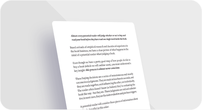 Almost every potential reader will judge whether or not to buy and read your book before they have read one single word inside the book. Based on loads of empirical research and decades of experience in the book business, we have a clear picture of what happens in the mind of a potential reader when judging a book. Even though we have a pretty good map of how people decide to buy a book (which we will outline soon), you must understand a key insight: this process is almost never conscious. These buying decisions are a series of instantaneous and mostly unconscious judgments. They are made in less than 60 seconds, and they are made together, each influencing the other, not individually. The reader often doesn’t know (or believe) they’re evaluating the book this way—but they are. These judgments are real and substan- tive; in most cases, they are the main evaluation and purchase triggers. A potential reader will consider these pieces of information about a book, (usually) in this order: 1. The title 2. The recommending source 3. The cover 4. The book description 5. The blurbs 6. The customer reviews 7. The author bio and picture (depending on where the picture is placed) 8. The length of the book 9. The price (though this can come sooner) 10. The book text itself (the “see inside” function online) We’ll cover how to create each of these pieces in more depth later on. For now, let’s walk through each step and unpack the reader’s judgments around it. 444 · ThE SCriBE METhOD