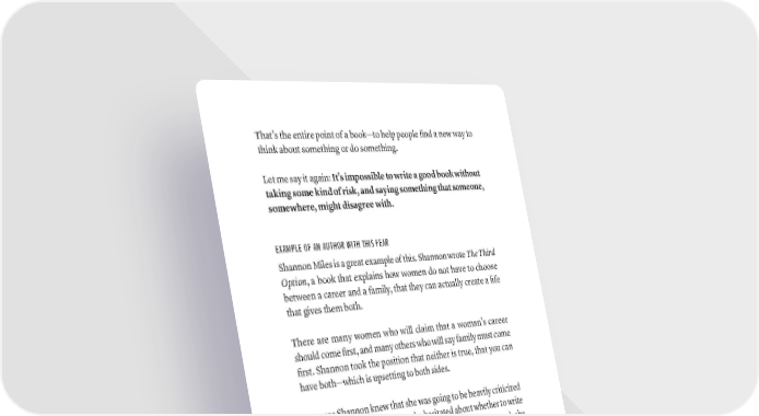 That’s the entire point of a book—to help people find a new way to think about something or do something. Let me say it again: It’s impossible to write a good book without taking some kind of risk, and saying something that someone, somewhere, might disagree with. EXAMPLE OF AN AUTHOR WITH THIS FEAR Shannon Miles is a great example of this. Shannon wrote The Third Option, a book that explains how women do not have to choose between a career and a family, that they can actually create a life that gives them both. There are many women who will claim that a woman’s career should come first, and many others who will say family must come first. Shannon took the position that neither is true, that you can have both—which is upsetting to both sides. Because Shannon knew that she was going to be heavily criticized and attacked from both sides, she hesitated about whether to write her book at all. Once she made the decision to move forward, she still found herself censoring her views and holding back. Eventually Shannon got past this worry. She focused not on her- self, but on her reader, and realized that by withholding her views or stories, she was not serving them; she was failing them—and betraying herself. As a result, she wrote a book that has been extraordinarily well- received. She did get some negative feedback of course, but it was overwhelmed by all the positive response and thanks from women who felt like she understood and spoke to them in a way no one else had. It’s OK to admit you feel bad when people say bad things about ThE Six fEArS yOU (COUlD) fACE WriTiNg yOUr BOOk · 35