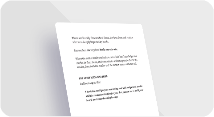 There are literally thousands of these. Reviews from real readers who were deeply impacted by books. Remember: the very best books are win-win. When the author really works hard, puts their best knowledge and stories in their book, and commits to delivering real value to the reader, then both the reader and the author come out better off. HOW A BOOK BUILDS YOUR BRAND It all sums up to this: A book is a multipurpose marketing tool with unique and special abilities to create attention for you, that you can use to build your brand and career in multiple ways. 384 · ThE SCriBE METhOD