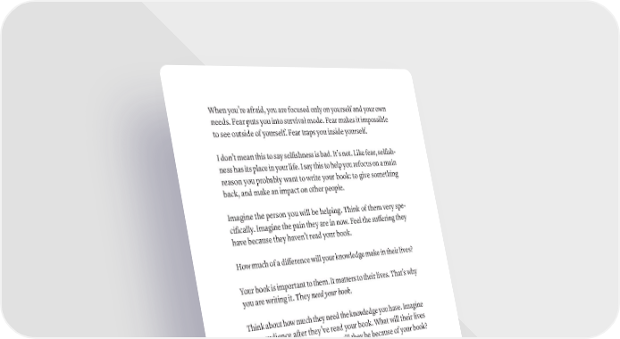 When you’re afraid, you are focused only on yourself and your own needs. Fear puts you into survival mode. Fear makes it impossible to see outside of yourself. Fear traps you inside yourself. I don’t mean this to say selfishness is bad. It’s not. Like fear, selfish- ness has its place in your life. I say this to help you refocus on a main reason you probably want to write your book: to give something back, and make an impact on other people. Imagine the person you will be helping. Think of them very spe- cifically. Imagine the pain they are in now. Feel the suffering they have because they haven’t read your book. How much of a difference will your knowledge make in their lives? Your book is important to them. It matters to their lives. That’s why you are writing it. They need your book. Think about how much they need the knowledge you have. Imagine your audience after they’ve read your book. What will their lives be like then? How much better will they be because of your book? Connect with that feeling. Can you do it—for them? You want to write your book to help other people solve a problem that you used to have, one that’s very painful to you. Helping those people is a big part of your motivation. And picturing those people in need, and you letting them down if you do not write your book, is a very powerful motivator. Using this motivation turns out to be the ultimate fear-buster: most people who can’t be courageous for themselves can easily be courageous for other people. And of course, if you just think about who your book is intended to help, you can focus on them. And if you do that—if you focus on hOW TO BEAT yOUr fEArS (AND fiNiSh yOUr BOOk) · 47