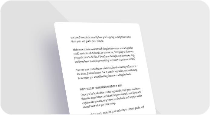 you need to explain exactly how you’re going to help them solve their pain and get to their benefit. Make sure this is so clear and simple that even a seventh-grader could understand. It should be as basic as, “I’m going to show you precisely how to do this. I’ll walk you through, step by step by step, until you have mastered everything necessary to get your results.” You can even frame this as a bulleted list of what they will learn in the book. Just make sure that it sounds appealing, and not boring. Remember you are still selling them on reading the book. PART 5: DESCRIBE YOUR BACKGROUND/ORIGIN OF BOOK Once you’ve hooked the reader, appealed to their pain, and shown them the benefit they can have if they overcome it, now it’s time to explain who you are, why you wrote the book, and why the reader should trust what you have to say. Essentially, you’ll establish your authority to be their guide, and contextualize the book for them. The best way to do this, again, is to tell a story. Why did you write this book? Why does this subject matter to you? How did you learn enough to be in a position to teach what you know to people? Why are you qualified—even uniquely qualified—to write this book? Why should the reader credit what you have to say? This is where you can talk about your hero’s journey story—what it took for you to get to this place—because this is where the reader is wondering why they should trust you. After all, if you are going to help them by teaching them so much, they need to know why they should listen to you. But, and this is VERY important: remember that the reader doesn’t care about you. They only care about you and your story insofar 112 · ThE SCriBE METhOD