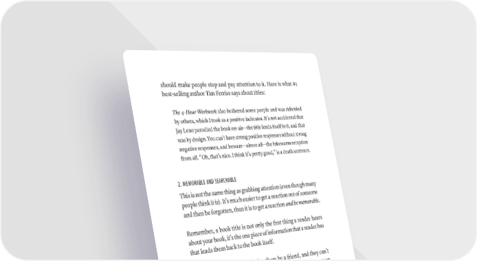 should make people stop and pay attention to it. Here is what #1 best-selling author Tim Ferriss says about titles: The 4-Hour Workweek also bothered some people and was ridiculed by others, which I took as a positive indicator. It’s not accidental that Jay Leno parodied the book on-air—the title lends itself to it, and that was by design. You can’t have strong positive responses without strong negative responses, and beware—above all—the lukewarm reception from all. “Oh, that’s nice. I think it’s pretty good,” is a death sentence. 2. MEMORABLE AND SEARCHABLE This is not the same thing as grabbing attention (even though many people think it is). It’s much easier to get a reaction out of someone and then be forgotten, than it is to get a reaction and be memorable. Remember, a book title is not only the first thing a reader hears about your book, it’s the one piece of information that a reader has that leads them back to the book itself. If your book is recommended to them by a friend, and they can’t remember the title, then they can’t go find it in a bookstore or on Amazon. Best-selling author Scott Berkun says it well: Often [the title] is all a potential buyer ever gets to see, and if they can draw interest, the book crosses its first of many hurdles in the improbable struggle of getting noticed. But titles only help so much. Most people hear about books the same way they hear about new bands. Or new people to meet. A friend or trusted source tells them it was good, and it was called . The title at that point serves as a moniker. It’s the thing you need to remember to get the thing you want to get and little more. This also means you want the book title to be easily searchable. In the world we live in, search is how people find things now. If your title does not lend itself to easy memorization and searchability on Google and Amazon, that is very bad. 186 · ThE SCriBE METhOD