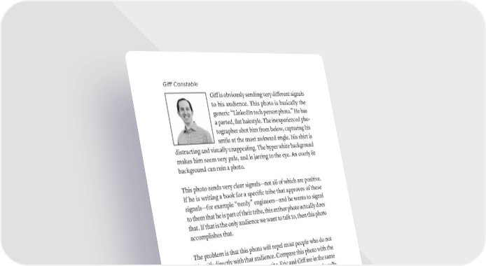 Giff Constable Giff is obviously sending very different signals to his audience. This photo is basically the generic “LinkedIn tech person photo.” He has a parted, flat hairstyle. The inexperienced pho- tographer shot him from below, capturing his smile at the most awkward angle. His shirt is distracting and visually unappealing. The hyper white background makes him seem very pale, and is jarring to the eye. An overly lit background can ruin a photo. This photo sends very clear signals—not all of which are positive. If he is writing a book for a specific tribe that approves of these signals—for example “nerdy” engineers—and he wants to signal to them that he is part of their tribe, this author photo actually does that. If that is the only audience we want to talk to, then this photo accomplishes that. The problem is that this photo will repel most people who do not identify directly with that audience. Compare this photo with the one above; it’s the complete opposite. Eric and Giff are in the same field, tech, and physically are very similar. But the photos feel totally different, don’t they? BUSINESS AUTHOR PHOTOS Patrick Lencioni This is a very traditional business professional author photo. Everything about this photo says that this man is an American business executive: he’s signaling solid, stable, trustworthy, and part of the establishment. The suit is tailored, dark, expensive, and tasteful, and he has a conservative tie on. His wedding ring is clearly show- ing. His hair is graying, combed but not stiff, and his smile is there, 272 · ThE SCriBE METhOD