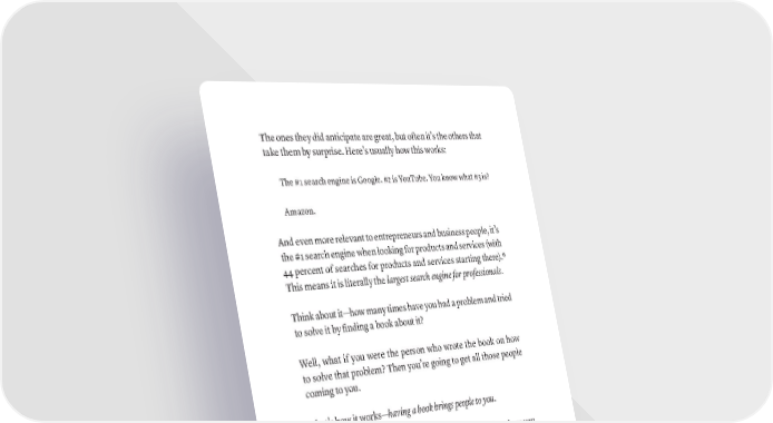 The ones they did anticipate are great, but often it’s the others that take them by surprise. Here’s usually how this works: The #1 search engine is Google. #2 is YouTube. You know what #3 is? Amazon. And even more relevant to entrepreneurs and business people, it’s the #1 search engine when looking for products and services (with 44 percent of searches for products and services starting there).6 This means it is literally the largest search engine for professionals. Think about it—how many times have you had a problem and tried to solve it by finding a book about it? Well, what if you were the person who wrote the book on how to solve that problem? Then you’re going to get all those people coming to you. That’s how it works—having a book brings people to you. It lets them know exactly who you are and shows them how you can help them. It’s the best marketing tool you could ever use, not just to build your brand, but to attract clients. Lemme give you a personal example: when we started our company, Scribe, we realized we had a rocket ship that we didn’t know how to fly. We needed to learn how to scale our company. What did I do? I went to Amazon to read books on the subject. Turns out, there are not a lot of great books out there about how to professionally manage and scale a fast-growing company. The 6 “Amazon Is the Starting Point For 44 Percent Of Consumers Searching For Products. Is Google Losing, Then?” Marketing Land, October 9, 2015. https://marketingland.com/amazon-is-the-starting-point-for-44-percent-of- consumers-searching-for-products-is-search-losing-then-145647. rEAliSTiC AND UNrEAliSTiC ExPECTATiONS fOr A BOOk · 371