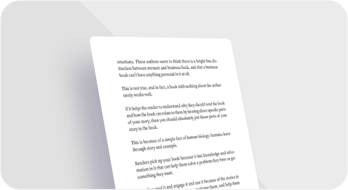 emotions. These authors seem to think there is a bright line dis- tinction between memoir and business book, and that a business book can’t have anything personal in it at all. This is not true, and in fact, a book with nothing about the author rarely works well. If it helps the reader to understand why they should read the book and how the book can relate to them by hearing about specific parts of your story, then you should absolutely put those parts of your story in the book. This is because of a simple fact of human biology: humans learn through story and example. Readers pick up your book because it has knowledge and infor- mation in it that can help them solve a problem they have or get something they want. But they read it and engage it and use it because of the stories in it that teach them, inspire them, motivate them, and help them understand and apply the knowledge. As much as possible, your book should encase your teachings and knowledge in stories. Those can be your stories, or they can be stories of other people. Either one works. WHAT PARTS OF YOUR STORY SHOULD BE IN YOUR BOOK? This is a pretty simple test to help you understand if a specific story should go in the book: Does this story add value for the reader? Literally just ask yourself that question. If it adds no value for the reader, then it doesn’t belong in the book. If it does, then it stays in. hOW MUCh Of yOUr STOry ShOUlD BE iN yOUr BOOk? · 417