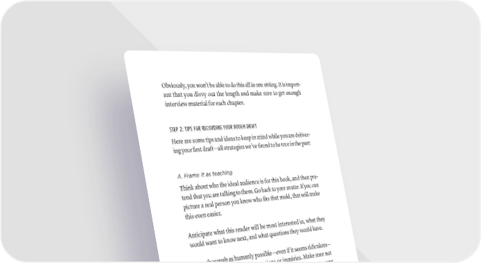 Obviously, you won’t be able to do this all in one sitting. It is import- ant that you divvy out the length and make sure to get enough interview material for each chapter. STEP 2: TIPS FOR RECORDING YOUR ROUGH DRAFT Here are some tips and ideas to keep in mind while you are deliver- ing your first draft—all strategies we’ve found to be true in the past: A. Frame it as teaching Think about who the ideal audience is for this book, and then pre- tend that you are talking to them. Go back to your avatar. If you can picture a real person you know who fits that mold, that will make this even easier. Anticipate what this reader will be most interested in, what they would want to know next, and what questions they would have. Be as thorough as humanly possible—even if it seems ridiculous— with the details of your instructions or inquiries. Make sure not to gloss over any steps or rungs in the ladder leading up to your conclusion, even if they seem trivial or self-evident, because the reader won’t fully understand unless you explain everything. B. Stay with the outline Your outline is sequential for a reason; don’t just move through it randomly from point to point. Stay with the outline, and on the point you mean to make. Remember, this is the foundation of the first draft, so the more you stay with the outline and on track, the easier it will be for you to use the transcript to write the book. You may realize you want to add or subtract information at some point down the line. That is precisely what later drafts are for. For now, stick with the outline. hOW TO WriTE yOUr firST DrAfT (ThE SCriBE METhOD) · 155