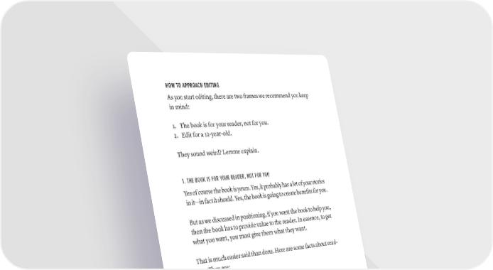HOW TO APPROACH EDITING As you start editing, there are two frames we recommend you keep in mind: 1. The book is for your reader, not for you. 2. Edit for a 12-year-old. They sound weird? Lemme explain. 1. THE BOOK IS FOR YOUR READER, NOT FOR YOU Yes of course the book is yours. Yes, it probably has a lot of your stories in it—in fact it should. Yes, the book is going to create benefits for you. But as we discussed in positioning, if you want the book to help you, then the book has to provide value to the reader. In essence, to get what you want, you must give them what they want. That is much easier said than done. Here are some facts about read- ers. They are: 1. Impatient 2. Selfish 3. Ignorant (about your subject) I don’t mean that in a bad way. It’s just how all readers are (includ- ing you and me). The reality is that in a book, you are buying the attention of the reader, ONE PARAGRAPH AT A TIME. You can write the book without worrying about fact, but once you start editing, it becomes very important. The point is that, as you write, you can think of yourself, but as you edit, you need to be thinking about your reader. 162 · ThE SCriBE METhOD