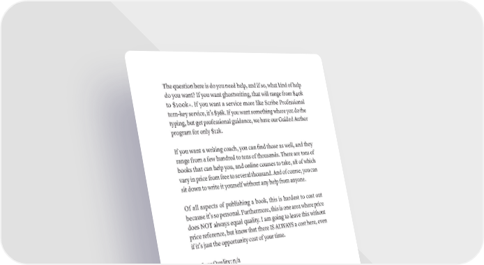 The question here is do you need help, and if so, what kind of help do you want? If you want ghostwriting, that will range from $40k to $100k+. If you want a service more like Scribe Professional turn-key service, it’s $36k. If you want something where you do the typing, but get professional guidance, we have our Guided Author program for only $12k. If you want a writing coach, you can find those as well, and they range from a few hundred to tens of thousands. There are tons of books that can help you, and online courses to take, all of which vary in price from free to several thousand. And of course, you can sit down to write it yourself without any help from anyone. Of all aspects of publishing a book, this is hardest to cost out because it’s so personal. Furthermore, this is one area where price does NOT always equal quality. I am going to leave this without price reference, but know that there IS ALWAYS a cost here, even if it’s just the opportunity cost of your time. • Low Quality: n/a • Acceptable: n/a • High Quality: n/a • Best Possible: n/a PUBLISHING COST: EDITING Editing is easier to price than writing, but still not as straightforward as you might imagine. The problem is not just the difference in the quality of editors; the problem is in the wide variation in different types of editing. For the purpose of this pricing, we will assume we’re talking about a full content edit, which is what most authors need after writing the rough draft of their manuscript. • Low Quality: Less than $1k 334 · ThE SCriBE METhOD