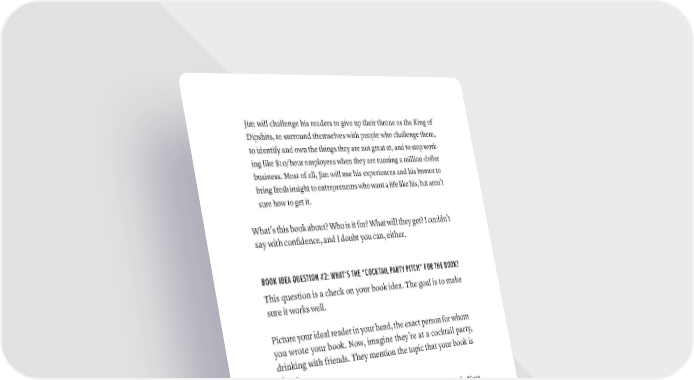 Jim will challenge his readers to give up their throne as the King of Dipshits, to surround themselves with people who challenge them, to identify and own the things they are not great at, and to stop work- ing like $10/hour employees when they are running a million-dollar business. Most of all, Jim will use his experiences and his humor to bring fresh insight to entrepreneurs who want a life like his, but aren’t sure how to get it. What’s this book about? Who is it for? What will they get? I couldn’t say with confidence, and I doubt you can, either. BOOK IDEA QUESTION #2: WHAT’S THE “COCKTAIL PARTY PITCH” FOR THE BOOK? This question is a check on your book idea. The goal is to make sure it works well. Picture your ideal reader in your head, the exact person for whom you wrote your book. Now, imagine they’re at a cocktail party, drinking with friends. They mention the topic that your book is about. Another person perks up—because they’ve read your book. Now they are about to recommend that this person read your book as well, since it is on the exact topic they are talking about. What do they say to recommend it? This is the one-sentence explanation that a real person would actu- ally say out loud to describe your book to their friends, not what you want them to say. That’s the cocktail party pitch. This is NOT your book description. This is NOT ad copy. This is about getting out of yourself and describing your book in the way that a real person would. 88 · ThE SCriBE METhOD