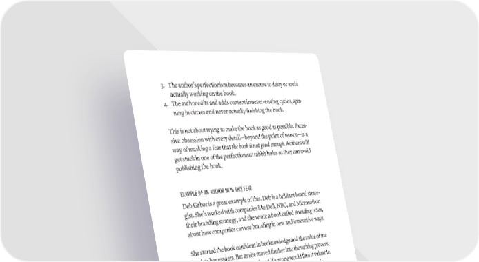 3. The author’s perfectionism becomes an excuse to delay or avoid actually working on the book. 4. The author edits and adds content in never-ending cycles, spin- ning in circles and never actually finishing the book. This is not about trying to make the book as good as possible. Exces- sive obsession with every detail—beyond the point of reason—is a way of masking a fear that the book is not good enough. Authors will get stuck in one of the perfectionism rabbit holes so they can avoid publishing the book. EXAMPLE OF AN AUTHOR WITH THIS FEAR Deb Gabor is a great example of this. Deb is a brilliant brand strate- gist. She’s worked with companies like Dell, NBC, and Microsoft on their branding strategy, and she wrote a book called Branding Is Sex, about how companies can use branding in new and innovative ways. She started the book confident in her knowledge and the value of the book to her readers. But as she moved further into the writing process, insecurity took hold. She wondered if anyone would find it valuable, and to compensate, she put more and more information into it. As a result, the book, without any conscious intent, became far too big and unwieldy. Because she was trying to put everything she knew into the book, instead of just focusing on what her audience valued and wanted to know, she ended up with a book that was way too long. In order to compensate for her insecurity, she turned to perfectionism, and it almost ruined her book. Thankfully, Deb is smart and self-aware, and once we walked her through what she was doing, she recognized it and was able to get her book refocused and sharply defined. Another thing we explained to Deb is the saying that “art is never done, it’s only abandoned.” The point is that being perfect is lit- ThE Six fEArS yOU (COUlD) fACE WriTiNg yOUr BOOk · 31