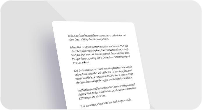 book. A book is what establishes a consultant as authoritative and raises their visibility about the competition. Ashley Welch and Justin Jones were in this predicament. They had taken their sales consulting firm, Somersault Innovations, to a high level, but they were not standing out until they wrote their book. This got them a speaking slot at Dreamforce, where they signed AT&T as a client. Kirk Drake owned a successful consulting firm that helped credit unions learn to market and sell better. He was doing fine, but it wasn’t until his book came out that he was able to command high six-figure fees and sign the biggest credit unions in the industry. Joe Mechlinkski used his two bestselling books, Grow Regardless and Shift the Work, to sign major Fortune 500 clients and be named the EY Entrepreneur of the Year. For a consultant, a book is the best marketing you can do. 2. PAID SPEAKING One of the major ways to make money from a book is through speaking engagements. It’s challenging to become a professional paid speaker without a book. People have started speaking careers without books of course, but almost all professional speakers eventually write a book; and when they do, the fee they can command usually triples. John Ruhlin is a terrific example. He was a successful corporate gifting expert but was only able to charge about $5K for an engage- ment. He published Giftology, and now regularly books keynotes for $30K or more. This is because a book is a credential for a speaker. It’s a basic 386 · ThE SCriBE METhOD