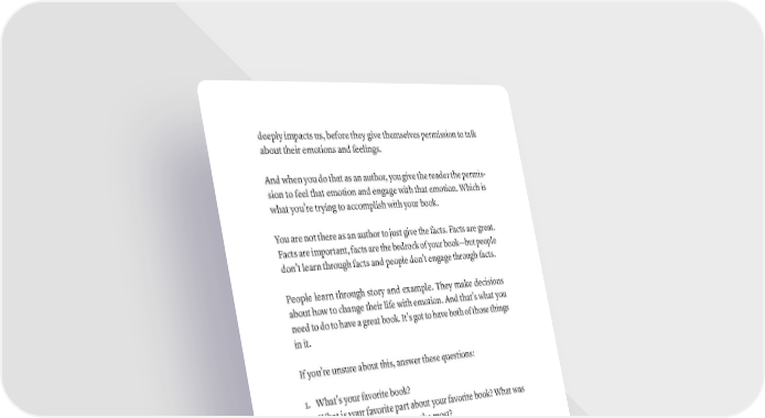 deeply impacts us, before they give themselves permission to talk about their emotions and feelings. And when you do that as an author, you give the reader the permis- sion to feel that emotion and engage with that emotion. Which is what you’re trying to accomplish with your book. You are not there as an author to just give the facts. Facts are great. Facts are important, facts are the bedrock of your book—but people don’t learn through facts and people don’t engage through facts. People learn through story and example. They make decisions about how to change their life with emotion. And that’s what you need to do to have a great book. It’s got to have both of those things in it. If you’re unsure about this, answer these questions: 1. What’s your favorite book? 2. What is your favorite part about your favorite book? What was the thing that impacted you the most? Right now you’re probably thinking about a part that was profound in the book that elicited a deep emotion in you. It wasn’t a fact. It was a story or an anecdote or a scene that brought something up in you. Do the same thing with your book. Tell stories and anecdotes that elicit emotion, because that will draw the reader in and make the facts stick to their brain. The more you show the ugly stuff, the more you say the things that everyone thinks and no one says, the more you show your true self and true thoughts—the better your book will be. 420 · ThE SCriBE METhOD
