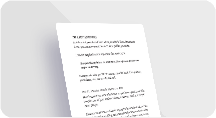 STEP 4: PICK YOUR FAVORITES At this point, you should have a long list of title ideas. Once that’s done, you can move on to the next step: picking your titles. I cannot emphasize how important this next step is: Everyone has opinions on book titles. Most of those opinions are stupid and wrong. Even people who get PAID to come up with book titles (editors, publishers, etc.) are usually bad at it. Test #1: Imagine People Saying the Title Here’s a great test as to whether or not you have a good book title: imagine one of your readers talking about your book at a party to other people. If you can see them confidently saying the book title aloud, and the people listening nodding and immediately either understanding what the book is about based on that (and perhaps a sentence or two of explanation) or asking for further explanation because it sounds interesting—then you’ve got a good title. If you imagine any other reaction than this one, you need to re-think your title, and probably change it. Remember, so much of book marketing boils down to word of mouth, and word of mouth is all about people signaling things to other people. You want your book title to inspire and motivate the right people to talk about it, because it lets them signal the right things to their friends. Test #2: (optional) Test Actual Clicks Here’s one of the keys to testing your titles: test both the main title 198 · ThE SCriBE METhOD