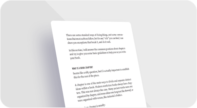There are some standard ways of doing things, and some conven- tions that most authors follow, but for any “rule” you can find, I can show you exceptions that break it, and do it well. In this section, I will answer the common questions about chapters and try to give you some basic guidelines to help you as you write your book. WHAT IS A BOOK CHAPTER? Seems like a silly question, but it’s actually important to establish this for the rest of the piece. A chapter is one of the main ways to divide and separate distinct ideas within a book. Modern nonfiction books always have chap- ters. This was not always the case. Many ancient works were not organized by chapter, and were either one long text like Beowolf, or were organized with verses, like Aristotle’s Politics. A modern chapter is usually: • a single cohesive idea • a step in the process you are describing • a single argument or position It can be one or all of those things. WHAT IS THE DIFFERENCE BETWEEN A PART AND A CHAPTER? For books with lots of chapters, these are often grouped into several “parts,” as another subdivision of the book. A part is simply a set of chapters that go together and fall under a larger idea. For example, from the Table of Contents of a book, there are three parts here, with a few chapters in each part. 426 · ThE SCriBE METhOD