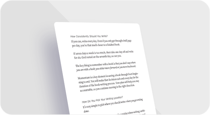 How Consistently Should You Write? If you can, write every day. Even if you only get through a half page per day, you’re that much closer to a finished book. If seven days a week is too much, then take one day off and write for six. God rested on the seventh day, so can you. The key thing to remember with a book is that you don’t stay where you are with a book; you either move forward or you move backward. Momentum is a key element in seeing a book through from begin- ning to end. You will make that decision each and every day for the duration of the book-writing process. Your plan will help you stay accountable, so you continue moving in the right direction. How Do You Pick Your Writing Location? It’s very simple to pick where you should write: where you get writing done. These are the general factors people consider when writing: ambi- ent noise, temperature, view, comfort, and isolation. A universal “correct” place to write doesn’t exist. If you write well in coffee shops, do that. If you write well at a desk in your basement, do that. Wherever you are most creative, most functional, and most confident, write there. Don’t waste time trying to find the “perfect place” to write, or a perfect tool, or the perfect desk. They don’t exist. People who get stuck on finding the perfect spot or the perfect inspiration to write are looking for a way to avoid the work. This unrecognized fear will cause them to wait for the perfect envi- ronment, but that perfect environment doesn’t exist. Even when accounting for someone’s personal preferences, if they think they’ve found the “perfect” writing place, that’s just the place 128 · ThE SCriBE METhOD