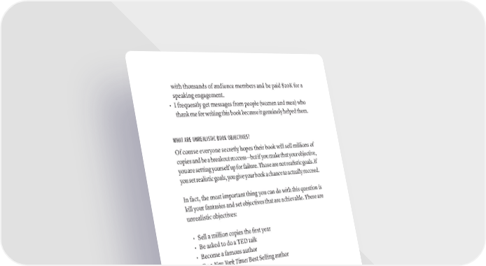 with thousands of audience members and be paid $20K for a speaking engagement. • I frequently get messages from people (women and men) who thank me for writing this book because it genuinely helped them. WHAT ARE UNREALISTIC BOOK OBJECTIVES? Of course everyone secretly hopes their book will sell millions of copies and be a breakout success—but if you make that your objective, you are setting yourself up for failure. Those are not realistic goals. If you set realistic goals, you give your book a chance to actually succeed. In fact, the most important thing you can do with this question is kill your fantasies and set objectives that are achievable. These are unrealistic objectives: • Sell a million copies the first year • Be asked to do a TED talk • Become a famous author • Be a New York Times Best Selling author • Get on Oprah/Ellen • Fill an ill-defined emotional void Here’s the thing about these objectives: they are not literally impos- sible. People have accomplished them all. We’ve had a few of our authors do them. But they are exceedingly rare, and most books have no shot at these objectives. The more you focus on realistic objectives, the better your book will be at hitting the audience you need to hit in order to succeed. REFERENCE: If you want to read a deeper dive into what exactly a book can get you, both in terms of branding and tangible ROI, read Reference piece 9.2: How Writing A Book Can Build Your Brand, and 9.3: How To Make Money With Your Book. figUrE OUT yOUr BOOk OBjECTivES · 61