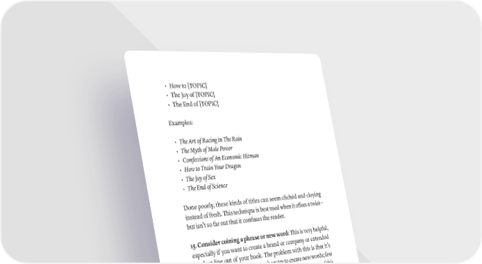 • How to [TOPIC] • The Joy of [TOPIC] • The End of [TOPIC] Examples: • The Art of Racing in The Rain • The Myth of Male Power • Confessions of An Economic Hitman • How to Train Your Dragon • The Joy of Sex • The End of Science Done poorly, these kinds of titles can seem clichéd and cloying instead of fresh. This technique is best used when it offers a twist— but isn’t so far out that it confuses the reader. 15. Consider coining a phrase or new word: This is very helpful, especially if you want to create a brand or company or extended product line out of your book. The problem with this is that it’s not an easy thing to do. Many authors try to create new words; few succeed, so try this sparingly. The most important element of this technique is that the word is easy to say and understand. Examples: • Babbitt • Denialism • Essentialism 16. Use Amazon/Goodreads/Wikipedia for inspiration: If you’re feeling stuck, you can always go look at how other books are named. 17. Use copywriting manuals for ideas: If you are truly stuck and cannot think of anything, read books about copywriting. They are 196 · ThE SCriBE METhOD