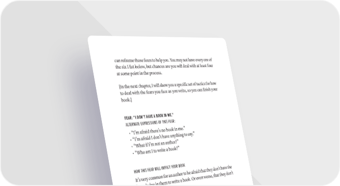can reframe those fears to help you. You may not have every one of the six I list below, but chances are you will deal with at least four at some point in the process. [In the next chapter, I will show you a specific set of tactics for how to deal with the fears you face as you write, so you can finish your book.] FEAR: “I DON’T HAVE A BOOK IN ME.” ALTERNATE EXPRESSIONS OF THIS FEAR: • “I’m afraid there’s no book in me.” • “I’m afraid I don’t have anything to say.” • “What if I’m not an author?” • “Who am I to write a book?” HOW THIS FEAR WILL IMPACT YOUR BOOK It’s very common for an author to be afraid that they don’t have the knowledge in them to write a book. Or even worse, that they don’t deserve to be an author. For most people, this is a version of what’s referred to as Imposter Syndrome. Imposter Syndrome is when someone—even a very accomplished person with a lot of experience and credentials—believes they don’t actually know what everyone thinks they know. They believe their ideas are either wrong or invalid, or that everyone already knows what they know. People with Imposter Syndrome have this idea in their heads that everyone else has it figured out, but they are the imposter. In the most extreme cases, Imposter Syndrome is when authors feel that their book will expose them as frauds or as fakers. 26 · ThE SCriBE METhOD