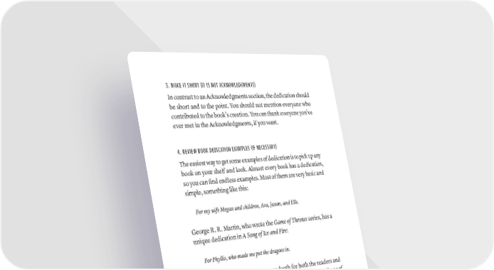 3. MAKE IT SHORT (IT IS NOT ACKNOWLEDGMENTS) In contrast to an Acknowledgments section, the dedication should be short and to the point. You should not mention everyone who contributed to the book’s creation. You can thank everyone you’ve ever met in the Acknowledgments, if you want. 4. REVIEW BOOK DEDICATION EXAMPLES (IF NECESSARY) The easiest way to get some examples of dedication is to pick up any book on your shelf and look. Almost every book has a dedication, so you can find endless examples. Most of them are very basic and simple, something like this: For my wife Megan and children, Ava, Jaxon, and Elle. George R. R. Martin, who wrote the Game of Thrones series, has a unique dedication in A Song of Ice and Fire: For Phyllis, who made me put the dragons in. This concise line holds enormous depth for both the readers and the person mentioned. If you’ve read the books or seen Game of Thrones, you’d know that dragons and the fantasy world they rep- resent were a big part of the appeal. To imagine the book without them would be nearly impossible. Phyllis clearly played a big role in the creation of this piece (it’s also an inside joke for fans). Here’s the dedication that C. S. Lewis wrote to his goddaughter in The Lion, The Witch, and the Wardrobe: My dear Lucy, I wrote this story for you, but when I began it I had not realized that girls grow quicker than books. As a result you are already too old for fairy tales, and by the time it is printed and bound you will be older still. But someday you will be old enough to start reading fairy tales again. You can then take WriTE yOUr BOOk DEDiCATiON · 205