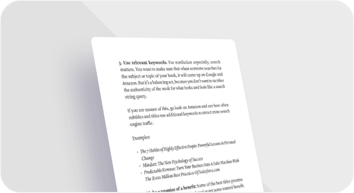 3. Use relevant keywords: For nonfiction especially, search matters. You want to make sure that when someone searches for the subject or topic of your book, it will come up on Google and Amazon. But it’s a balancing act, because you don’t want to sacrifice the authenticity of the work for what looks and feels like a search string query. If you are unsure of this, go look on Amazon and see how often subtitles and titles use additional keywords to attract more search engine traffic. Examples: • The 7 Habits of Highly Effective People: Powerful Lessons in Personal Change • Mindset: The New Psychology of Success • Predictable Revenue: Turn Your Business Into A Sales Machine With The $100 Million Best Practices Of Salesforce.com 4. Make a promise of a benefit: Some of the best titles promise to help readers achieve a desired goal or get some wanted benefit. They specifically call out an end result that people want: Examples: • How to Win Friends and Influence People • Getting Things Done • Think and Grow Rich 5. Be simple and direct: Some of the very best titles are just basic statements about what the book is. There is nothing wrong with this—it can work well, especially for strictly instructional books. Examples: • Getting Past No 192 · ThE SCriBE METhOD