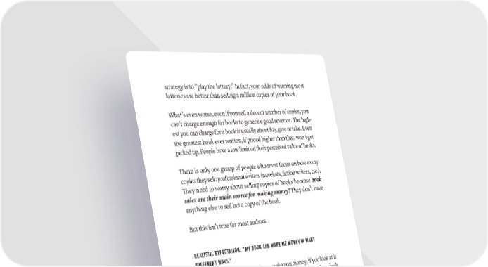 strategy is to “play the lottery.” In fact, your odds of winning most lotteries are better than selling a million copies of your book. What’s even worse, even if you sell a decent number of copies, you can’t charge enough for books to generate good revenue. The high- est you can charge for a book is usually about $25, give or take. Even the greatest book ever written, if priced higher than that, won’t get picked up. People have a low limit on their perceived value of books. There is only one group of people who must focus on how many copies they sell: professional writers (novelists, fiction writers, etc.). They need to worry about selling copies of books because book sales are their main source for making money! They don’t have anything else to sell but a copy of the book. But this isn’t true for most authors. REALISTIC EXPECTATION: “MY BOOK CAN MAKE ME MONEY IN MANY DIFFERENT WAYS.” The good news is that a book can make you money, if you look at it from a different perspective. This is how most of our authors look at books: A book is a multipurpose marketing tool with the special ability to create authority and visibility that authors can turn into profit. For entrepreneurs, consultants, professionals, and other busi- nesspeople, the book itself creates credibility and authority that is the means to selling other, larger opportunities that can be very profitable. For example, if you’re a consultant and have a skill or knowledge that is very valuable to people, the best way to get more clients and charge them more money is by writing a book about what you know. This establishes you as an authority and gives you credibility, rEAliSTiC AND UNrEAliSTiC ExPECTATiONS fOr A BOOk · 365