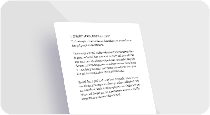 6. DO NOT POST ON SOCIAL MEDIA TO GET FEEDBACK The best way to ensure you choose the mediocre (or even bad) cover is to poll people on social media. Your average potential reader—when asked which cover they like— is going to channel their inner mob mentality and respond to the title that is most like what already saturates your market. They pick the most common design, because to them, common means fitting in. True, fitting in is better than looking a mess, but the cover game, first and foremost, is about BEING MEMORABLE. Beyond that, a good book cover is not designed to appeal to every- one. It’s designed to appeal to the target audience of the book. Your 2,500 Facebook friends include people you knew in high school and in-laws and that guy you met at a conference three years ago. They are not the target audience for your book. hOW TO gET A grEAT BOOk COvEr · 291
