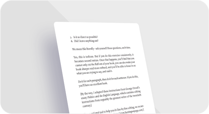 5. Is it as direct as possible? 6. Did I leave anything out? We mean this literally—ask yourself these questions, each time. Yes, this is tedious. But if you do this exercise consistently, it becomes second nature. Once that happens, you’ll find that you cannot only cut the fluff out of your book, you can also make your book sharper and more refined, and you’ll be able to hone in on what you are trying to say, and nail it. Do it for each paragraph, then do it for each sentence. If you do this, you’ll have an excellent book. [By the way, I adapted these instructions from George Orwell’s essay Politics and the English Language, which contains editing instructions from arguably the greatest writer of the twentieth century.] [As an optional tool to help you do line-by-line editing, we recom- mend the Hemingway Editor: http://www.hemingwayapp.com/] PART 3: READ-ALOUD EDITING This is an editing process that’s not commonly taught but is a secret trick of numerous bestselling authors. Brené Brown, Neil Strauss, myself—we all do this. When I was first writing I Hope They Serve Beer in Hell, I had teams of proofreaders working through the book. First I proofread it, then I had the help of professional editor friends, and finally the publishing company had their people do their copyedits. I did not think that a single mistake would sneak by, and happily locked in the manuscript. 166 · ThE SCriBE METhOD
