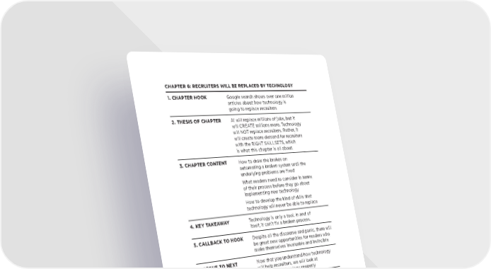 CHAPTER 6: RECRUITERS WILL BE REPLACED BY TECHNOLOGY 1. CHAPTER HOOK Google search shows over one million articles about how technology is going to replace recruiters 2. THESIS OF CHAPTER AI will replace millions of jobs, but it will CREATE millions more. Technology will NOT replace recruiters. Rather, it will create more demand for recruiters with the RIGHT SKILLSETS, which is what this chapter is all about. 3. CHAPTER CONTENT How to draw the brakes on automating a broken system until the underlying problems are fixed What readers need to consider in terms of their process before they go about implementing new technology How to develop the kind of skills that technology will never be able to replace 4. KEY TAKEAWAY Technology is only a tool. In and of itself, it can’t fix a broken process. 5. CALLBACK TO HOOK Despite all the discourse and panic, there will be great new opportunities for readers who make themselves invaluable and invincible 6. SEGUE TO NEXT Now that you understand how technology CHAPTER will help recruiters, we will look at how to use technology properly QUESTION: WHY NOT STRUCTURE CHAPTERS LIKE YOU’LL WRITE THEM? If you have outlining experience, you may notice we don’t structure our outline in the traditional way, something like this: 1. Major Point 1 ◦ Minor Point 1 i. Story Y ii. Example Y ◦ Minor Point 2 i. Story X ii. Example X 104 · ThE SCriBE METhOD