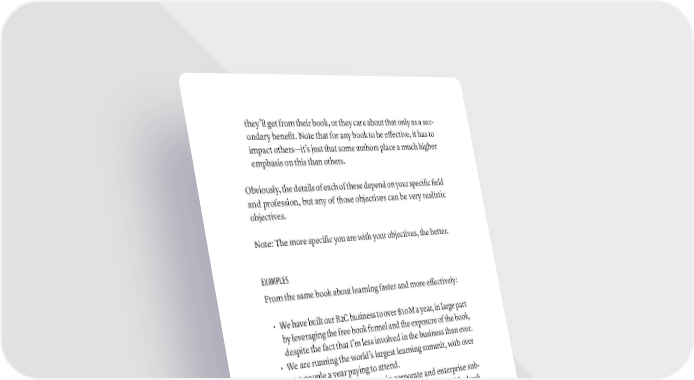 they’ll get from their book, or they care about that only as a sec- ondary benefit. Note that for any book to be effective, it has to impact others—it’s just that some authors place a much higher emphasis on this than others. Obviously, the details of each of these depend on your specific field and profession, but any of those objectives can be very realistic objectives. Note: The more specific you are with your objectives, the better. EXAMPLES From the same book about learning faster and more effectively: • We have built our B2C business to over $10M a year, in large part by leveraging the free book funnel and the exposure of the book, despite the fact that I’m less involved in the business than ever. • We are running the world’s largest learning summit, with over 500 people a year paying to attend. • We’re doing over $1M a year in corporate and enterprise sub- scriptions, because of the exposure and credibility of the book and the event. • We have sparked research, conversation, and debate about education reform, and are working on a few not-for-profit pilot initiatives to improve education. From the same book that teaches women how to sell like men, but ethically and with heart: • I have a large following of female entrepreneurs and my brand is recognized and well-respected. • I’m a sought-out speaker on the topic of sales and female empowerment. I have done a TEDx talk and been asked to speak at large, recognizable conferences like SXSW and Traf- fic & Conversion Summit. I will be asked to speak in venues 60 · ThE SCriBE METhOD
