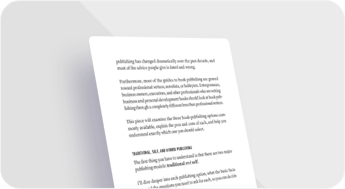 publishing has changed dramatically over the past decade, and most of the advice people give is dated and wrong. Furthermore, most of the guides to book publishing are geared toward professional writers, novelists, or hobbyists. Entrepreneurs, business owners, executives, and other professionals who are writing business and personal development books should look at book pub- lishing through a completely different lens than professional writers. This piece will examine the three book-publishing options com- monly available, explain the pros and cons of each, and help you understand exactly which one you should select. TRADITIONAL, SELF, AND HYBRID PUBLISHING The first thing you have to understand is that there are two major publishing models: traditional and self. I’ll dive deeper into each publishing option, what the basic facts are, and the questions you need to ask for each, so you can decide which one to use. There is also a third option, called hybrid publishing. In my opin- ion, hybrid is by far the worst of the three options, and I will briefly cover it at the end. TRADITIONAL PUBLISHING SUMMARY In traditional publishing, an author must find a book agent to rep- resent them to publishing companies. Then, along with the agent, pitch a book publishing company (which are almost all based in New York City, such as HarperCollins or Simon & Schuster) with their book idea. If the pitch is successful and the publishing com- pany offers the author a publishing deal, the publishing company purchases the ownership of the print license from the author in 314 · ThE SCriBE METhOD