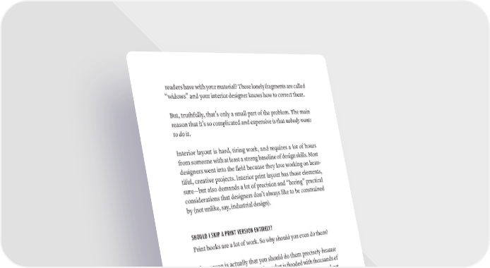 readers have with your material? These lonely fragments are called “widows” and your interior designer knows how to correct them. But, truthfully, that’s only a small part of the problem. The main reason that it’s so complicated and expensive is that nobody wants to do it. Interior layout is hard, tiring work, and requires a lot of hours from someone with at least a strong baseline of design skills. Most designers went into the field because they love working on beau- tiful, creative projects. Interior print layout has those elements, sure—but also demands a lot of precision and “boring” practical considerations that designers don’t always like to be constrained by (not unlike, say, industrial design). SHOULD I SKIP A PRINT VERSION ENTIRELY? Print books are a lot of work. So why should you even do them? The reason is actually that you should do them precisely because they’re a lot of work. The book market is flooded with thousands of new authors every day. As you know, it can be difficult to stand out. Because of how challenging doing a good print book is, and how embarrassingly ugly it can be when done wrong, a lot of new authors are veering away from the challenge and publishing in eBook format only. In many circles, this has started to be a divid- ing line between books that should be taken seriously, and books that shouldn’t. Many people see eBooks as “not real books” and dismiss them as less impressive than paperbacks. If you are doing a business book, then this is crucial. You can’t really hand out (or sell) an eBook at a conference or speaking engagement. Creating a high-quality paperback or hardcover version is one of DESigN yOUr BOOk lAyOUT · 297