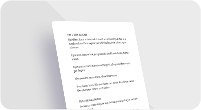 STEP 3: BUILD DEADLINES Deadlines force action and demand accountability. Below is a rough outline of how to pace yourself, which you can adjust to your schedule. If you want to move fast, give yourself a deadline of about a chapter a week. If you want to move at a reasonable speed, give yourself two weeks per chapter. If you want to move slower, allow three weeks. If you have a hectic life, do a chapter per month. And then question if you have the time to even do this. STEP 4: ANNOUNCE THE BOOK To take accountability one step further: announce that you are work- ing on a book. Use whatever social media platform you prefer, but the point is to publicly claim your intention to people you care about. You’ll get a lot of positive feedback, which will help you start, and the fact that you have announced your intention will help you push through when you are wavering. Note: If you’re serious about writing this book, the platform you’re most uncomfortable about putting it on is the one you should use. That means it’s the one with the most people on it that you care about. If you are afraid of telling them, it’s all the more reason to do it. Remember, we want to identify any and all resistance and push through it. 130 · ThE SCriBE METhOD