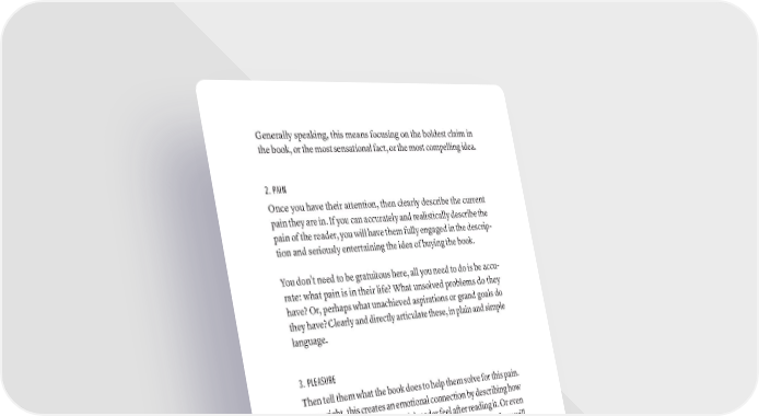 Generally speaking, this means focusing on the boldest claim in the book, or the most sensational fact, or the most compelling idea. 2. PAIN Once you have their attention, then clearly describe the current pain they are in. If you can accurately and realistically describe the pain of the reader, you will have them fully engaged in the descrip- tion and seriously entertaining the idea of buying the book. You don’t need to be gratuitous here, all you need to do is be accu- rate: what pain is in their life? What unsolved problems do they have? Or, perhaps what unachieved aspirations or grand goals do they have? Clearly and directly articulate these, in plain and simple language. 3. PLEASURE Then tell them what the book does to help them solve for this pain. Done right, this creates an emotional connection by describing how the book will make the potential reader feel after reading it. Or even better, what the reader will get out of reading the book—how will their life be different because they read this book? Will it make them happy or rich? Will it help them lose weight or have more friends? What do they get once they read this book? Be clear about the benefits, don’t insinuate them. You are selling a result to the reader, not a process (even though your book is the process). Explain exactly what the book is about, in clear, obvious terms. 4. LEGITIMACY This is simply about letting the reader know why they should listen to you, why you are the authority and the expert that they need to hOW TO WriTE A BOOk DESCriPTiON ThAT SEllS · 243