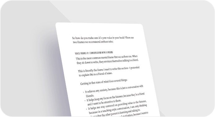 So how do you make sure it’s your voice in your book? There are two frames we recommend authors take: VOICE FRAME #1: CONVERSATION WITH A FRIEND This is the most common mental frame that our authors use. When they sit down to write, they envision themselves talking to a friend. This is literally the frame I used to write this section—I pretended to explain this to a friend of mine. Getting in that state of mind does several things: • It relieves any anxiety, because this is just a conversation with friends. • It helps keep my focus on the listener, because they’re a friend and I want to be attentive to them. • It helps me stay centered on providing value to the listener, because in a teaching-style conversation, I am only thinking about what the other person is learning and taking in. • It helps me keep momentum and motivation, because I want to make sure I am always helpful to my friend. John Steinbeck says it best: Forget your generalized audience. In the first place, the nameless, face- less audience will scare you to death and in the second place, unlike the theater, it doesn’t exist. In writing, your audience is one single reader. I have found that sometimes it helps to pick out one person — a real person you know, or an imagined person and write to that one. VOICE FRAME #2: HELP A STRANGER HEAL THE SAME PAIN YOU HAD This is very similar to the “conversation with a friend” frame, but it is also different in a few ways. If you envision yourself helping a stranger solve a painful problem, you do these things: hOW TO WriTE yOUr firST DrAfT (ThE vOMiT METhOD) · 143