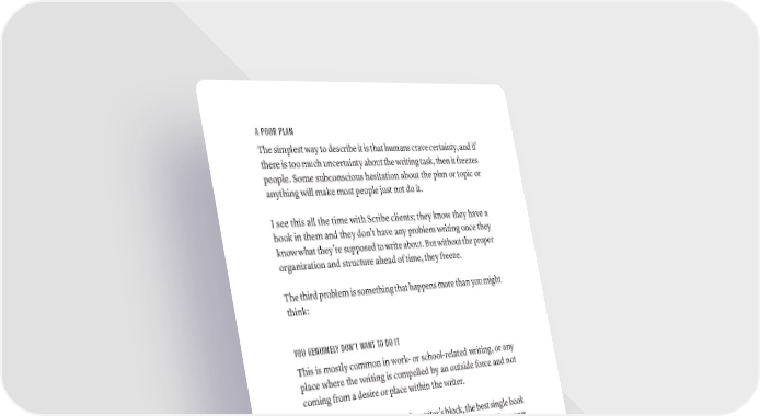 A POOR PLAN The simplest way to describe it is that humans crave certainty, and if there is too much uncertainty about the writing task, then it freezes people. Some subconscious hesitation about the plan or topic or anything will make most people just not do it. I see this all the time with Scribe clients; they know they have a book in them and they don’t have any problem writing once they know what they’re supposed to write about. But without the proper organization and structure ahead of time, they freeze. The third problem is something that happens more than you might think: YOU GENUINELY DON’T WANT TO DO IT This is mostly common in work- or school-related writing, or any place where the writing is compelled by an outside force and not coming from a desire or place within the writer. [If you want to dive deep into the writer’s block, the best single book on the topic is Conceptual Blockbusting. It’s been out for thirty years and is in its fifth edition (it’s that good).] THE BEST STRATEGY TO BEAT WRITER’S BLOCK I have two different strategies that have proven very effective over time: the best, and the rest. The best is a very simple one. When I am stuck, I ask myself the question: What am I afraid of? Hint: it’s pretty much always some fear you don’t want to face (here is a list of common fears: scribewriting.com/book-writing-fears). hOW DO yOU BEAT WriTEr’S BlOCk? · 433