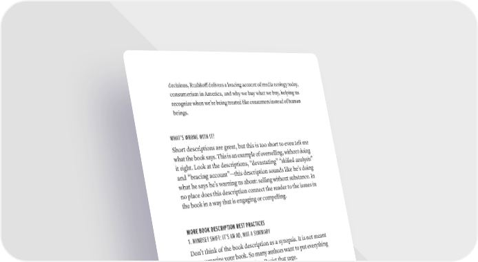decisions, Rushkoff delivers a bracing account of media ecology today, consumerism in America, and why we buy what we buy, helping us recognize when we’re being treated like consumers instead of human beings. WHAT’S WRONG WITH IT? Short descriptions are great, but this is too short to even tell me what the book says. This is an example of overselling, without doing it right. Look at the descriptions, “devastating” “skilled analysis” and “bracing account”—this description sounds like he’s doing what he says he’s warning us about: selling without substance. In no place does this description connect the reader to the issues in the book in a way that is engaging or compelling. MORE BOOK DESCRIPTION BEST PRACTICES 1. MINDSET SHIFT: IT’S AN AD, NOT A SUMMARY Don’t think of the book description as a synopsis. It is not meant to summarize your book. So many authors want to put everything about their book in this section. Resist that urge. It is an advertisement. Think of it like a trailer for your book. It is designed to make people want to read your book. You want them to take action and buy it. 2. USE COMPELLING KEYWORDS It’s not enough to be accurate; you need to use high-traffic keywords that increase the likelihood your book will get picked up in search. For example, if Sports Illustrated does a book, you’d want to not only say Sports Illustrated magazine but also mention the names of the A-list athletes in the book. Even better, use words that evoke an emotional response on the part of the reader. Don’t use “jerk” when “asshole” will work. 250 · ThE SCriBE METhOD