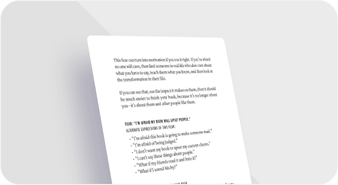 This fear can turn into motivation if you use it right. If you’re afraid no one will care, then find someone in real life who does care about what you have to say, teach them what you know, and then look at the transformation in their life. If you can see that, see the impact it makes on them, then it should be much easier to finish your book, because it’s no longer about you—it’s about them and other people like them. FEAR: “I’M AFRAID MY BOOK WILL UPSET PEOPLE.” ALTERNATE EXPRESSIONS OF THIS FEAR: • “I’m afraid this book is going to make someone mad.” • “I’m afraid of being judged.” • “I don’t want my book to upset my current clients.” • “I can’t say these things about people.” • “What if my friends read it and hate it?” • “What if I sound bitchy?” HOW THIS FEAR WILL IMPACT YOUR BOOK This fear is a major book killer. The fear of judgment is crippling to many authors, and prevents them from either writing their book, or from writing the book that they really want to write, or telling the stories they want to tell in their book. Here’s the simple fact about books: if no one at all disagrees with what you are saying, then you aren’t saying anything worth putting in a book. If I wrote a book about how the sky is blue, why would anyone care? Everyone already knows that. A book should make new claims, or reframe old information, or take a position that stands in opposi- tion to conventional wisdom, or teach something new or different or contrary. 34 · ThE SCriBE METhOD