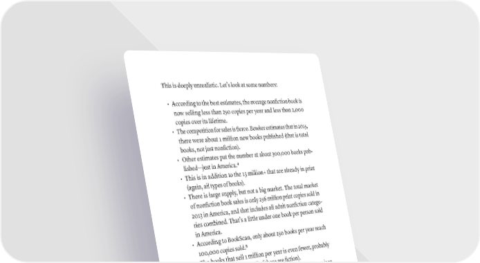 This is deeply unrealistic. Let’s look at some numbers: • According to the best estimates, the average nonfiction book is now selling less than 250 copies per year and less than 2,000 copies over its lifetime. • The competition for sales is fierce. Bowker estimates that in 2015, there were about 1 million new books published (that is total books, not just nonfiction). • Other estimates put the number at about 300,000 books pub- lished—just in America.4 • This is in addition to the 13 million+ that are already in print (again, all types of books). • There is large supply, but not a big market. The total market of nonfiction book sales is only 256 million print copies sold in 2013 in America, and that includes all adult nonfiction catego- ries combined. That’s a little under one book per person sold in America. • According to BookScan, only about 250 books per year reach 100,000 copies sold.5 • The books that sell 1 million per year is even fewer, probably around 20 (and almost all of those are fiction). • The list of books that have sold 10 million copies in history is so small there is a Wikipedia page about them. The facts are clear: very, very few books sell a lot of copies. The reality is, if you sell even 10,000 copies of a nonfiction book, that is very good, and you should be very happy with that. For most nonfiction authors, the return on time invested is horren- dous if you measure it only in terms of the expected value of book sales. It’s basically the same thing as saying that your retirement 4 “Books Published per Country per Year.” Wikipedia. Wikimedia Foundation, September 14, 2019. https:// en.wikipedia.org/wiki/Books_published_per_country_per_year. 5 Kremer, John. Quora.com. John Kremer, August 24, 2015. https://www.quora.com/Books/ Books-How-many-people-each-year-write-a-book-that-gets-100-000-copies-sold. 364 · ThE SCriBE METhOD
