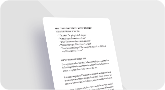 FEAR: “I’M AFRAID MY BOOK WILL MAKE ME LOOK STUPID.” ALTERNATE EXPRESSIONS OF THIS FEAR: • “I’m afraid I’m going to look stupid.” • “What if I get all one-star reviews?” • “What if everyone who reads it, hates it?” • “What will people think if there’s a typo?” • “I’m afraid something will be wrong with my book, and I’ll look stupid to everyone I know.” HOW THIS FEAR WILL IMPACT YOUR BOOK The biggest unspoken fear that I believe (virtually) every author has is that they will embarrass themselves. I saved this for last because almost every fear above boils down to this one. This fear is very rational. For many professionals, writing a bad book is actually worse than writing no book at all. This is because for someone with a certain level of status, a bad book will hurt their career. For others, it goes even further. For some, the book is very attached to their identity. They see the book as an extension of themselves, and they are worried that if the book isn’t well received, then it means they will personally look bad. No one wants to look flawed to their peers, especially with something as personal as a book. This fear can get so bad, people will literally forego the tens of thou- sands of dollars they pay us to help them write a book—all because they’re afraid to hit the final “publish my book” button. I’m not exaggerating at all. We have authors who will work for months, do all the difficult editing and revisions, go through the entire publishing process, and then, when there is literally nothing left to do besides give the final approval, will completely ghost on us. They can’t face their fear that the book isn’t good, so they avoid even talking about it. ThE Six fEArS yOU (COUlD) fACE WriTiNg yOUr BOOk · 37