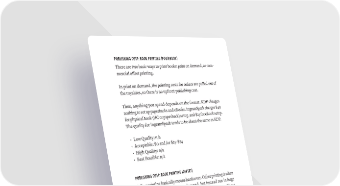 PUBLISHING COST: BOOK PRINTING (POD/EBOOK) There are two basic ways to print books: print on demand, or com- mercial offset printing. In print on demand, the printing costs for orders are pulled out of the royalties, so there is no upfront publishing cost. Thus, anything you spend depends on the format. KDP charges nothing to set up paperbacks and eBooks. IngramSpark charges $49 for physical book (HC or paperback) setup, and $25 for eBook setup. The quality for IngramSpark tends to be about the same as KDP. • Low Quality: n/a • Acceptable: $0 and/or $25–$74 • High Quality: n/a • Best Possible: n/a PUBLISHING COST: BOOK PRINTING (OFFSET) Offset printing basically means hardcover. Offset printing is when the books are not printed on demand, but instead run in large batches, which is necessary for high-quality hardcovers. These tend to be higher quality, but they do cost much more, if for no other reason than you are paying for the printing of the book before it’s done. It’s almost impossible to quote a price here without knowing the quantity of books you’ll be ordering. For example, 1,000 books will usually cost you between $5 and $7 apiece, whereas if you print 5,000, the price goes down to around $3, and more than 10,000, the price often drops below $2. Furthermore, not everyone needs a hardcover. For this reason, we cannot really include this in the cost of publishing, but know that if you want high-quality hardcovers, then you will have to spend money on printing the books. hOW MUCh DOES iT COST TO SElf-PUBliSh A BOOk? · 337
