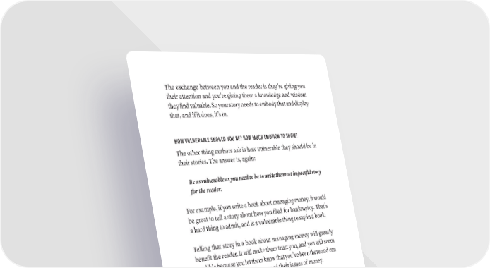The exchange between you and the reader is they’re giving you their attention and you’re giving them a knowledge and wisdom they find valuable. So your story needs to embody that and display that, and if it does, it’s in. HOW VULNERABLE SHOULD YOU BE? HOW MUCH EMOTION TO SHOW? The other thing authors ask is how vulnerable they should be in their stories. The answer is, again: Be as vulnerable as you need to be to write the most impactful story for the reader. For example, if you write a book about managing money, it would be great to tell a story about how you filed for bankruptcy. That’s a hard thing to admit, and is a vulnerable thing to say in a book. Telling that story in a book about managing money will greatly benefit the reader. It will make them trust you, and you will seem credible because you let them know that you’ve been there and can help them get over their shame and their issues of money. But if the book is about knitting, I’m not sure how much sense it makes to talk about bankruptcy. That doesn’t get the reader any- thing. In that case, it feels like an emotional release for the author, but irrelevant to the reader. Your book should never be a place for you to dump your emotions on the reader. If writing the book is therapy for you, that’s okay. But you should not ask the reader to be your therapist. Think about it like any sort of sharing with a friend. If your friend has a bad day and tells you about it, you listen and empathize. Then if you had a bad day, you share that as well. You’re sharing, you’re empathizing with each other, that’s okay, right? 418 · ThE SCriBE METhOD