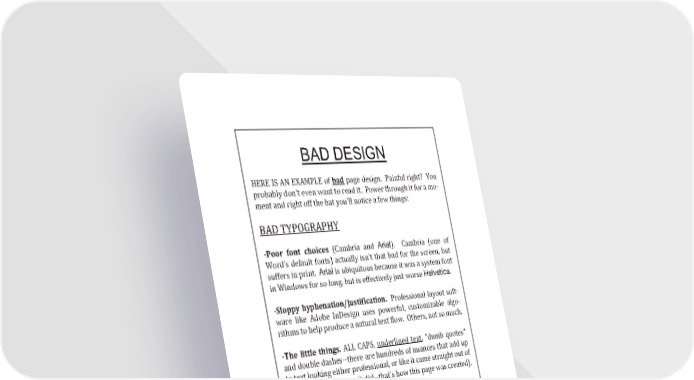 BAD DESIGN HERE IS AN EXAMPLE of bad page design. Painful right? You · · · · · · GOOD DESIGN · · · · · · probably don't even want to read it. Power through it for a mo- ment and right off the bat you'll notice a few things: BAD TYPOGRAPHY Here is an example of good page design. Right off the bat you’ notie soe ipotant diffeenes -Poor font choices (Cambria and Arial). Cambria (one of Word's default fonts) actually isn't that bad for the screen, but GOOD TYPOGRAPHY suffers in print. Arial is ubiquitous because it was a system font • Professional Typefaces dobe ason €o and Brandon Text‚ in Windows for so long, but is effectively just worse Helvetica. ason is onsideed a ƒey “safe” pi† and a popua hoie aong boo† designes fo good eason: it eads ƒey o‡ -Sloppy hyphenation/justification. Professional layout soft- fotaby and suits a ˆide ƒaiety of ontent. ware like Adobe InDesign uses powerful, customizable algo- rithms to help produce a natural text flow. Others, not so much. • Natural-looking Justification & Careful Hyphenation Thee aen’t any huge gaps betˆeen ˆods o “addes” of -The little things. ALL CAPS, underlined text, "dumb quotes" hyphens unning doˆn the side of a paagaph. and double dashes--there are hundreds of nuances that add up to text looking either professional, or like it came straight out of • The Little Things Make a Big Difference Word (and in this case it did--that's how this page was created). Small CapsŒ “uy ŽuotesŒ” e dashes—and no undeines. That ast one is neˆs to ost peopeŒ but apat fo in†sŒ BAD USE OF SPACE Pretty much everywhere--the margins are too small, the space undeining is osty a ei of the anua typeˆite. ‘oday between lines is too tight, and space after each sentence is too ˆe an shoˆ emphasis in betterŒ oe professional ˆays. big. It's a subtle thing but makes a huge difference in readability. GOOD USE OF SPACE The te”t on this page has oo to beatheŒ is set on a baseine BAD STRUCTURE gidŒ and has singe spaes afte puntuation doube‡spaing Most writing apps include a defined hierarchy for organizing in- is ˆongŒ foget ˆhat you •ngish teahe said‚. –ieŒ isn’t it— formation--Heading 1, Heading 2, etc.--and most writers com- pletely ignore it right out of the gate. Instead they opt for arbi- GOOD STRUCTURE trary or inconsistent headings that make it difficult for the The infoation is eay and onsistenty ogani˜ed. ™uh reader to skim text quickly or understand how it is prioritized easie fo the eade to fooˆŒ absobŒ efeene and s†i. ("is this a new topic, or just a subsection?"). For example, alt- hough the three headings on this page all reference the same "level" of information, they are each styled differently. GOOD DESIGN · 19 18 - BAD DESIGN 294 · ThE SCriBE METhOD