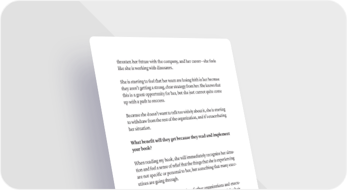 threaten her future with the company, and her career—she feels like she is working with dinosaurs. She is starting to feel that her team are losing faith in her because they aren’t getting a strong, clear strategy from her. She knows that this is a great opportunity for her, but she just cannot quite come up with a path to success. Because she doesn’t want to talk too widely about it, she is starting to withdraw from the rest of the organization, and it’s exacerbating her situation. What benefit will they get because they read and implement your book? When reading my book, she will immediately recognize her situa- tion and feel a sense of relief that the things that she is experiencing are not specific or personal to her, but something that many exec- utives are going through. The case studies and examples of other organizations and execu- tives that have been through similar journeys will highlight their successes and failures, and draw out lessons that are useful to her. It also will provide her with some tools and techniques for handling the issues that she is facing, including a “six-point roadmap” for creating a strategy and plan that will be successful. It will also give her confidence to talk knowledgeably about digital and technology trends by introducing her to a new model called the “eight technology forces” (e.g., quantum computing and block- chain) that covers predictions of how future technology trends will impact business and society, providing her with reference materials that will help her to make progress with her strategy. Her anxiety will be alleviated through the tone of the book, which 80 · ThE SCriBE METhOD