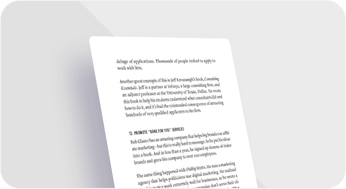 deluge of applications. Thousands of people rushed to apply to work with him. Another great example of this is Jeff Kavanaugh’s book, Consulting Essentials. Jeff is a partner at Infosys, a large consulting firm, and an adjunct professor at the University of Texas, Dallas. He wrote this book to help his students understand what consultants did and how to do it, and it’s had the unintended consequence of attracting hundreds of very qualified applicants to his firm. 12. PROMOTE “DONE FOR YOU” SERVICES Bob Glazer has an amazing company that helps big brands use affili- ate marketing—but this is really hard to message. So he put his ideas into a book. And in less than a year, he signed up dozens of major brands and grew his company to over 100 employees. The same thing happened with Phillip Stutts. He runs a marketing agency that helps politicians use digital marketing. He realized that his tactics work extremely well for businesses, so he wrote a book about how most marketing companies don’t serve their cli- ents, and how a company can audit them to get better results. What happened? The corporate side of his business more than doubled in a year. 13. SELL A VIDEO COURSE/INFORMATION PRODUCT If your book teaches something for which there is a high ROI for the reader, you can create what amounts to an advanced version that is delivered as a video course, charge much more money for it, then use the book to push people to that course. One of the main benefits is that while people will not pay more than about $25 for a book, they will often pay $500 or more for a video course of the EXACT SAME material. 392 · ThE SCriBE METhOD