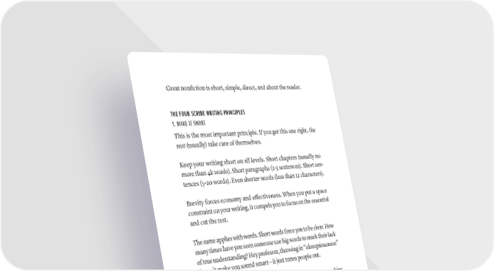 Great nonfiction is short, simple, direct, and about the reader. THE FOUR SCRIBE WRITING PRINCIPLES 1. MAKE IT SHORT This is the most important principle. If you get this one right, the rest (usually) take care of themselves. Keep your writing short on all levels. Short chapters (usually no more than 4k words). Short paragraphs (2-3 sentences). Short sen- tences (5-20 words). Even shorter words (less than 12 characters). Brevity forces economy and effectiveness. When you put a space constraint on your writing, it compels you to focus on the essential and cut the rest. The same applies with words. Short words force you to be clear. How many times have you seen someone use big words to mask their lack of true understanding? Hey professor, throwing in “obsequiousness” doesn’t make you sound smart—it just tunes people out. One key point: make it as short as possible without leaving anything out. Short does not mean missing essential content. 2. MAKE IT SIMPLE Simple is very similar to short, but not the same thing. You can write something that’s short but complex. That doesn’t work well. Simple words and sentences force you to write in plain English. Even difficult and complex ideas can be broken down into small words and short sentences. As Richard Feynman said, if you cannot explain your idea simply, it probably means you don’t fully under- stand it (which is bad, if you’re writing a book). Simple words and sentences also enable you to be understood by 134 · ThE SCriBE METhOD