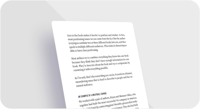 tion in the book makes it harder to position and market. In fact, most positioning issues we see come from the fact that the author is trying to combine two or three different books into one, and thus speak to multiple different audiences. This makes it almost impos- sible to have clear positioning. Most authors try to combine everything they know into one book because they think they don’t have enough information for one book. They’re insecure about the book and try to compensate by cramming it with everything possible. As I’ve said, that’s the worst thing you can do. It results in a bloated, meandering mess that is hard to describe to people and has no natural audience. AN EXAMPLE OF A MEATBALL SUNDAE We worked with a pair of authors, Bryan and Shannon Miles, who together had built the most successful VA company in America (Belay Solutions) by connecting great VAs with a process that works at scale for companies and busy entrepreneurs. They also had built an incredible culture at Belay, being named the #1 Company Cul- ture in America by Entrepreneur Magazine, and has also provided an incredible set of opportunities to mothers who wanted to work from home. They were rightly proud of all three things, and had a vision of a book that talked about how VA will change work, and how to build a great VA culture, and how to use that culture to attract more women. They had a broad, but very vague idea, of how their book could talk about all three things. This was not going to work. These are three different and very dis- tinct ideas. We went around and around with them trying to find a positioning for one book about this, until I finally told them: 422 · ThE SCriBE METhOD