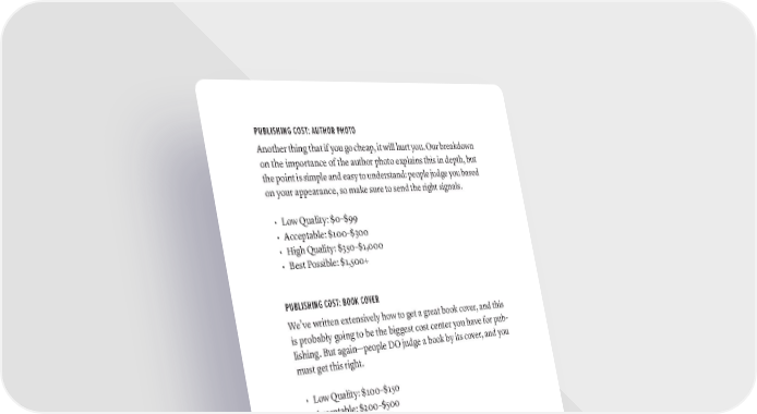 PUBLISHING COST: AUTHOR PHOTO Another thing that if you go cheap, it will hurt you. Our breakdown on the importance of the author photo explains this in depth, but the point is simple and easy to understand: people judge you based on your appearance, so make sure to send the right signals. • Low Quality: $0–$99 • Acceptable: $100–$300 • High Quality: $350–$1,000 • Best Possible: $1,500+ PUBLISHING COST: BOOK COVER We’ve written extensively how to get a great book cover, and this is probably going to be the biggest cost center you have for pub- lishing. But again—people DO judge a book by its cover, and you must get this right. • Low Quality: $100–$150 • Acceptable: $200–$500 • High Quality: $750–$1,500 • Best Possible: $2,000+ PUBLISHING COST: BOOK INTERIOR Book interior really only matters when you get it wrong. No one notices when you get it right (unless it’s just an amazing design or something like that), so you don’t need to go super expensive here, you just need to get it “not wrong.” • Low Quality: $0–$500 (DIY software like Vellum is in the middle of this range) • Acceptable: $750–1000 • High Quality: $1,500 • Best Possible: $2,500+ 336 · ThE SCriBE METhOD