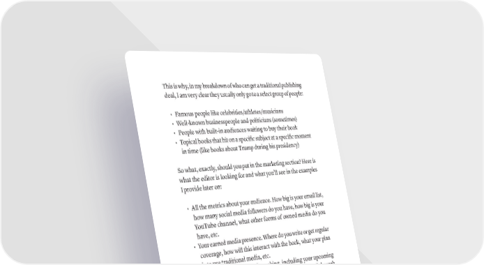 This is why, in my breakdown of who can get a traditional publishing deal, I am very clear they usually only go to a select group of people: • Famous people like celebrities/athletes/musicians • Well-known businesspeople and politicians (sometimes) • People with built-in audiences waiting to buy their book • Topical books that hit on a specific subject at a specific moment in time (like books about Trump during his presidency) So what, exactly, should you put in the marketing section? Here is what the editor is looking for and what you’ll see in the examples I provide later on: • All the metrics about your audience. How big is your email list, how many social media followers do you have, how big is your YouTube channel, what other forms of owned media do you have, etc. • Your earned media presence. Where do you write or get regular coverage, how will this interact with the book, what your plan is to use traditional media, etc. • Public appearances and speaking, including your upcoming speaking schedule, how many copies you plan to sell through speaking or appearances, anything like that. • Organizations and memberships you belong to, and how they intend to help. • Your network, and how you plan to use it. Who are you friends with, how have they committed to help you, what organizations are backing you, what will they do with the book, etc. • Optional, but huge: If you have published a book in the past and it sold well, put those numbers here. If you had a book that did not sell well, then explain why it didn’t. 4. CHAPTER DESCRIPTION/OUTLINE This is pretty simple. You want to create a Table of Contents for your book, with a quick description of what will be in each chapter. 356 · ThE SCriBE METhOD